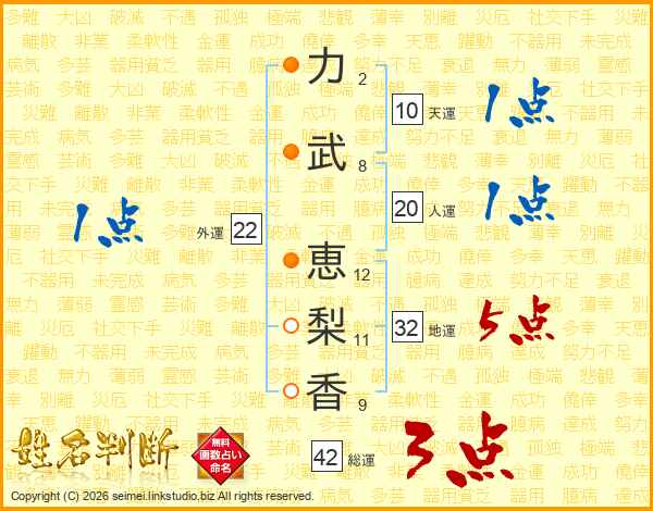 力(2画)武(8画) 恵(12画)梨(11画)香(9画)