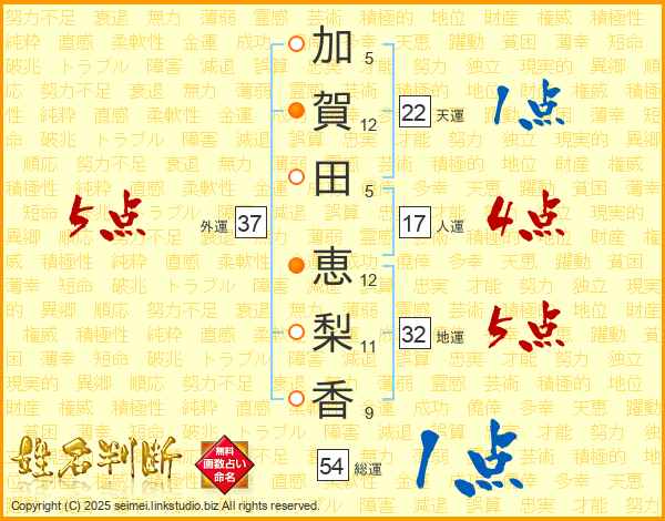 加(5画)賀(12画)田(5画) 恵(12画)梨(11画)香(9画)