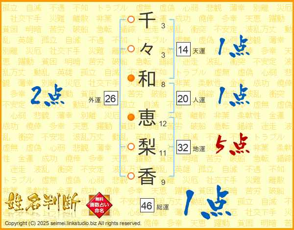 千(3画)々(3画)和(8画) 恵(12画)梨(11画)香(9画)