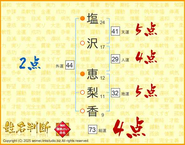 塩(24画)沢(17画) 恵(12画)梨(11画)香(9画)