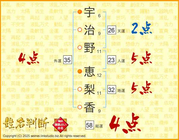 宇(6画)治(9画)野(11画) 恵(12画)梨(11画)香(9画)