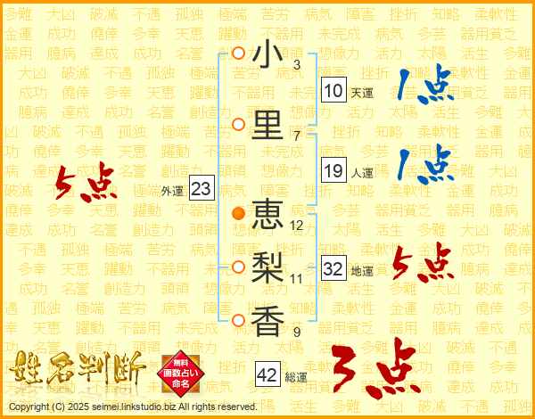 小(3画)里(7画) 恵(12画)梨(11画)香(9画)