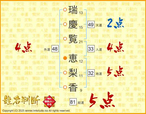 瑞(13画)慶(15画)覧(21画) 恵(12画)梨(11画)香(9画)