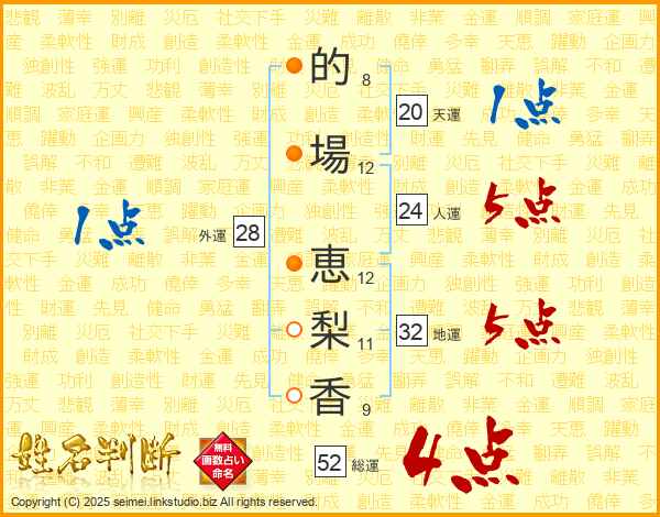 的(8画)場(12画) 恵(12画)梨(11画)香(9画)