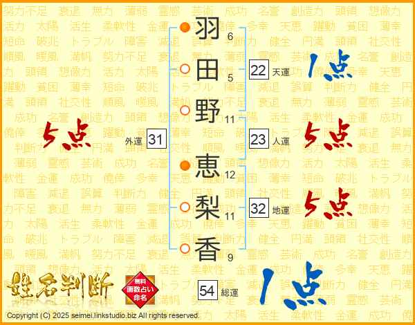 羽(6画)田(5画)野(11画) 恵(12画)梨(11画)香(9画)
