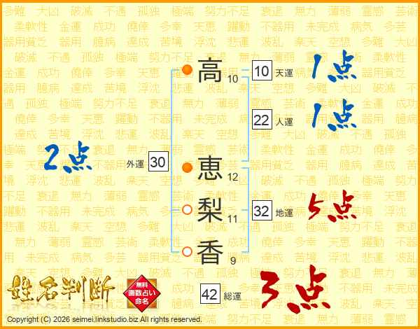 高(10画) 恵(12画)梨(11画)香(9画)