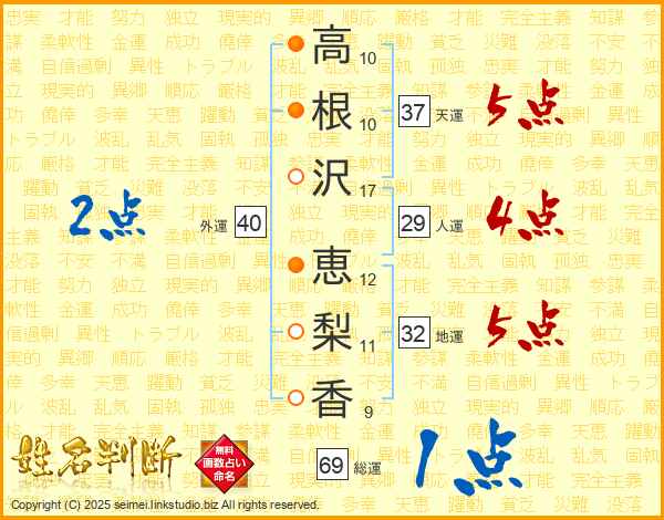 高(10画)根(10画)沢(17画) 恵(12画)梨(11画)香(9画)