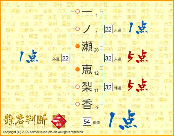 一(1画)ノ(1画)瀬(20画) 恵(12画)梨(11画)香(9画)