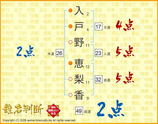 入(2画)戸(4画)野(11画) 恵(12画)梨(11画)香(9画)