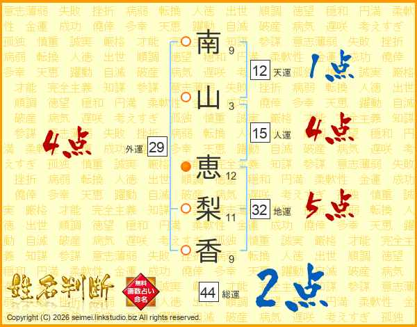 南(9画)山(3画) 恵(12画)梨(11画)香(9画)