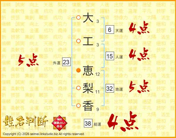 大(3画)工(3画) 恵(12画)梨(11画)香(9画)