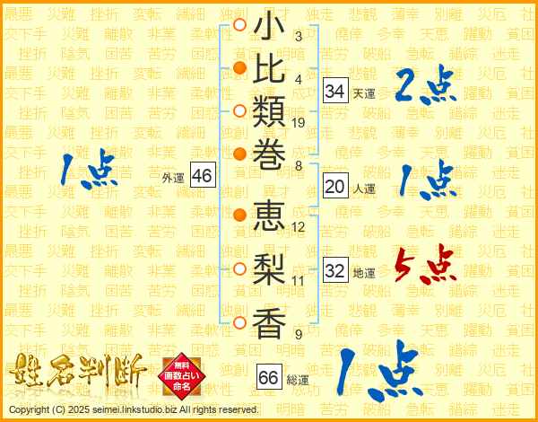 小(3画)比(4画)類(19画)巻(8画) 恵(12画)梨(11画)香(9画)