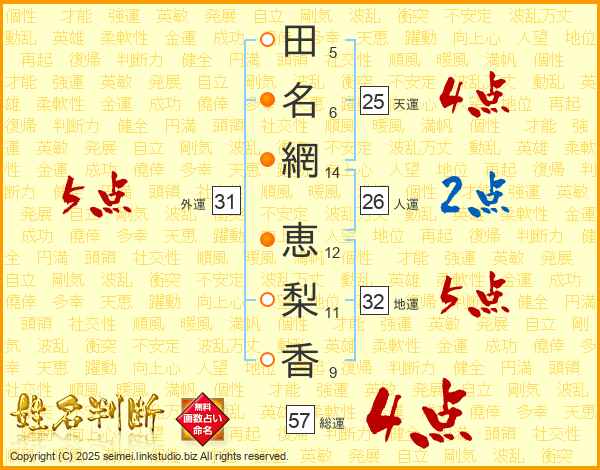 田(5画)名(6画)網(14画) 恵(12画)梨(11画)香(9画)