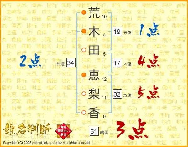 荒(10画)木(4画)田(5画) 恵(12画)梨(11画)香(9画)