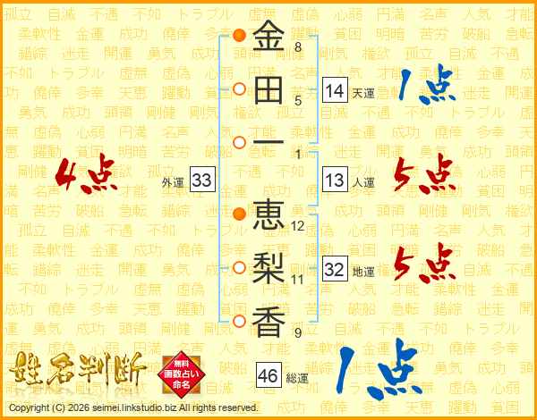金(8画)田(5画)一(1画) 恵(12画)梨(11画)香(9画)