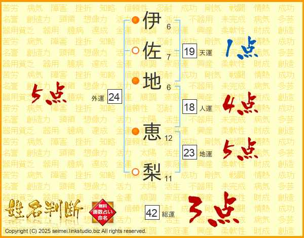 伊(6画)佐(7画)地(6画) 恵(12画)梨(11画)
