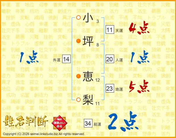 小(3画)坪(8画) 恵(12画)梨(11画)