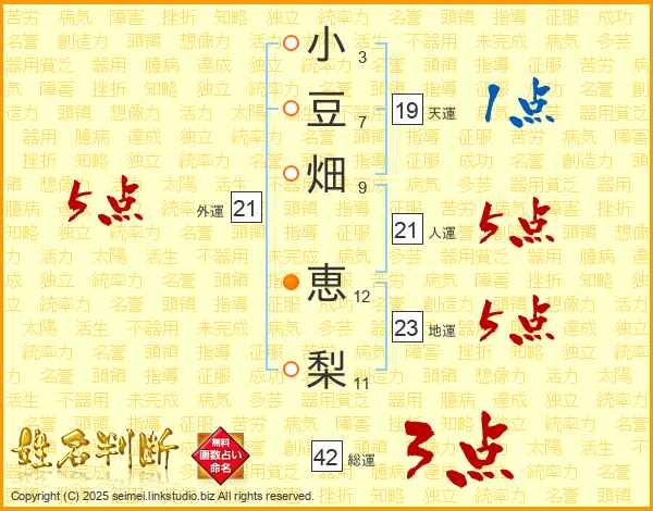 小(3画)豆(7画)畑(9画) 恵(12画)梨(11画)