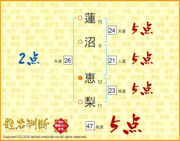 蓮(15画)沼(9画) 恵(12画)梨(11画)