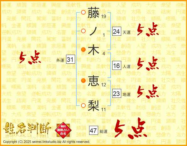 藤(19画)ノ(1画)木(4画) 恵(12画)梨(11画)