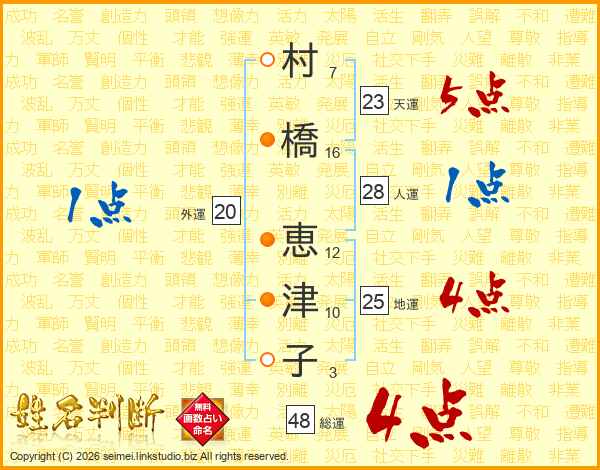 村(7画)橋(16画) 恵(12画)津(10画)子(3画)