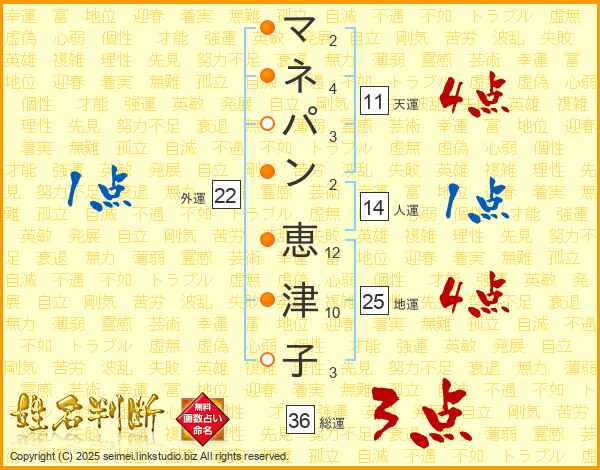 マ(2画)ネ(4画)パ(3画)ン(2画) 恵(12画)津(10画)子(3画)