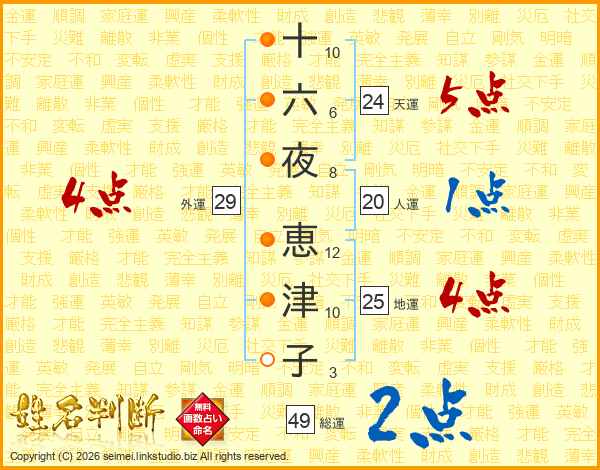 十(10画)六(6画)夜(8画) 恵(12画)津(10画)子(3画)