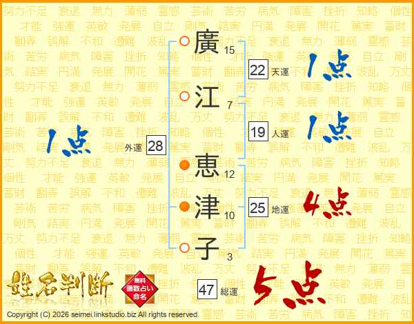 廣(15画)江(7画) 恵(12画)津(10画)子(3画)