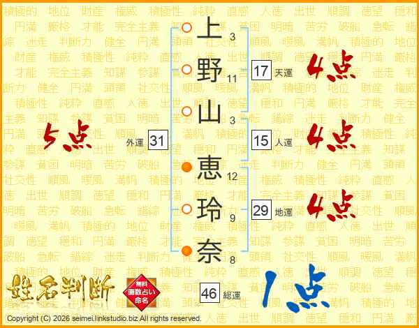 上(3画)野(11画)山(3画) 恵(12画)玲(9画)奈(8画)