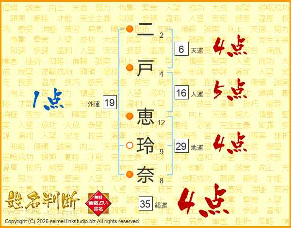 二(2画)戸(4画) 恵(12画)玲(9画)奈(8画)