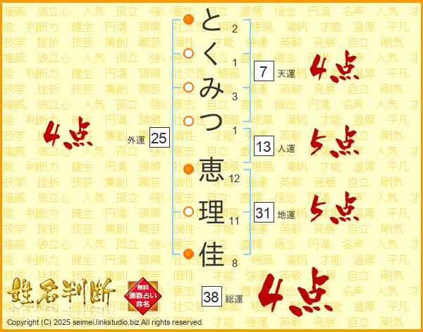 と(2画)く(1画)み(3画)つ(1画) 恵(12画)理(11画)佳(8画)