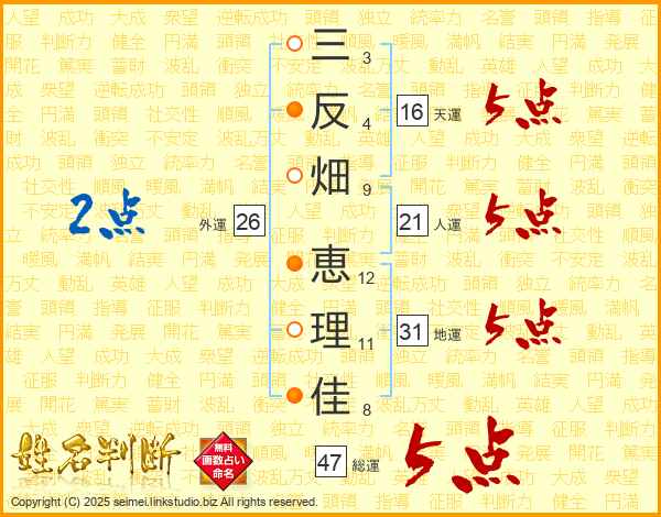 三(3画)反(4画)畑(9画) 恵(12画)理(11画)佳(8画)