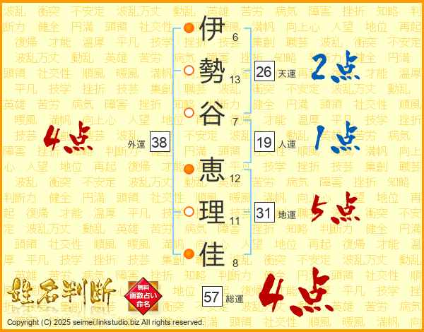 伊(6画)勢(13画)谷(7画) 恵(12画)理(11画)佳(8画)