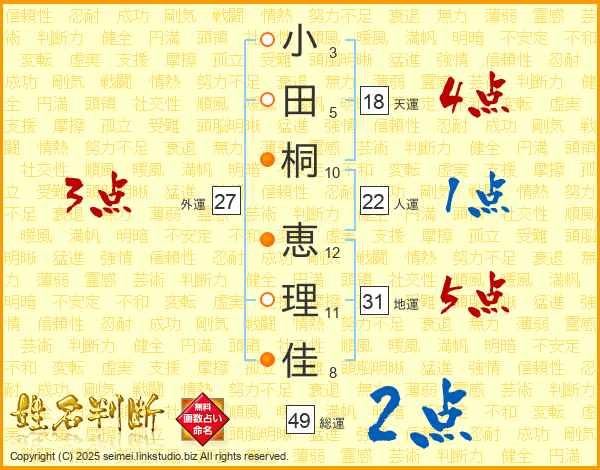 小(3画)田(5画)桐(10画) 恵(12画)理(11画)佳(8画)