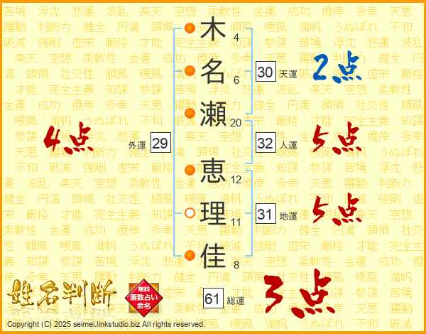 木(4画)名(6画)瀬(20画) 恵(12画)理(11画)佳(8画)