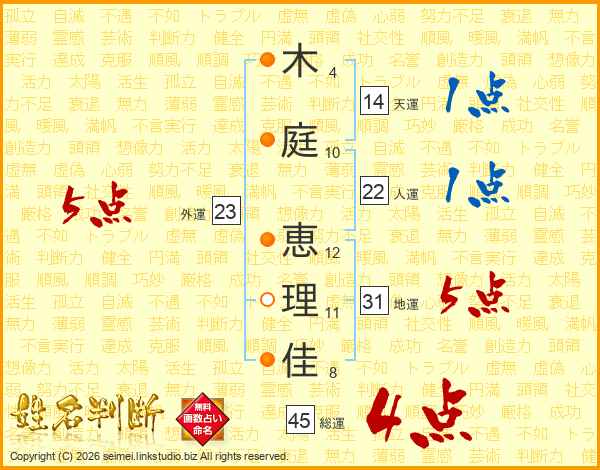 木(4画)庭(10画) 恵(12画)理(11画)佳(8画)