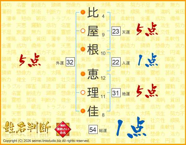 比(4画)屋(9画)根(10画) 恵(12画)理(11画)佳(8画)