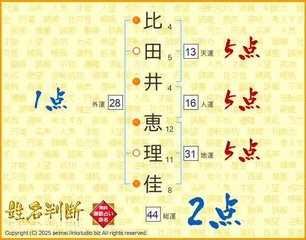 比(4画)田(5画)井(4画) 恵(12画)理(11画)佳(8画)
