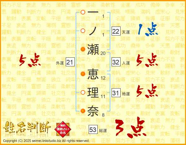 一(1画)ノ(1画)瀬(20画) 恵(12画)理(11画)奈(8画)