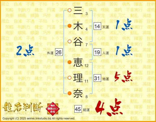 三(3画)木(4画)谷(7画) 恵(12画)理(11画)奈(8画)
