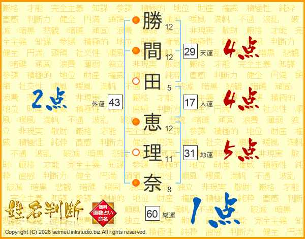 勝(12画)間(12画)田(5画) 恵(12画)理(11画)奈(8画)