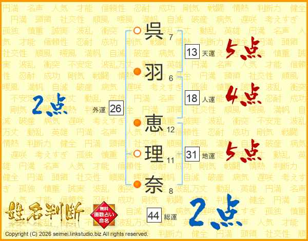 呉(7画)羽(6画) 恵(12画)理(11画)奈(8画)