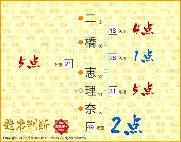 二(2画)橋(16画) 恵(12画)理(11画)奈(8画)