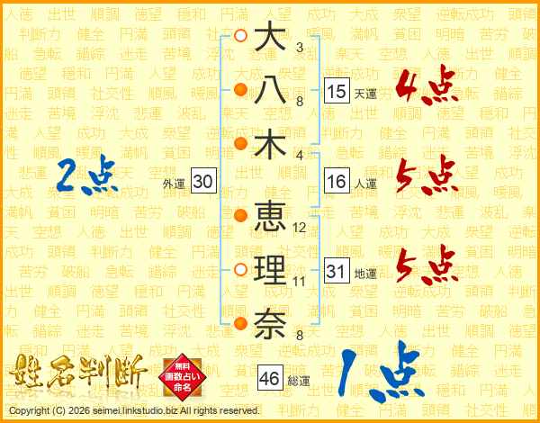 大(3画)八(8画)木(4画) 恵(12画)理(11画)奈(8画)