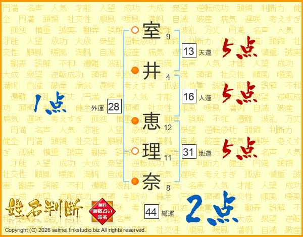 室(9画)井(4画) 恵(12画)理(11画)奈(8画)