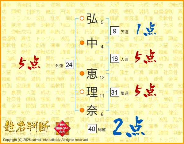 弘(5画)中(4画) 恵(12画)理(11画)奈(8画)