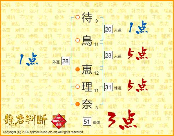待(9画)鳥(11画) 恵(12画)理(11画)奈(8画)