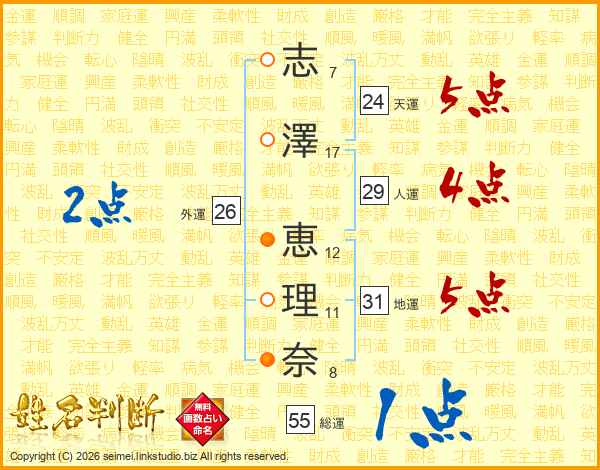 志(7画)澤(17画) 恵(12画)理(11画)奈(8画)