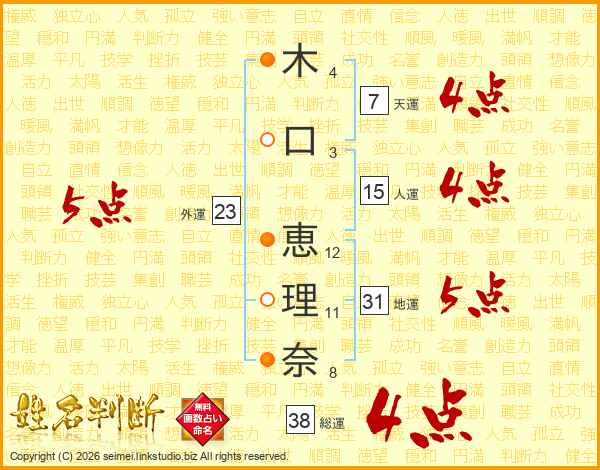 木(4画)口(3画) 恵(12画)理(11画)奈(8画)