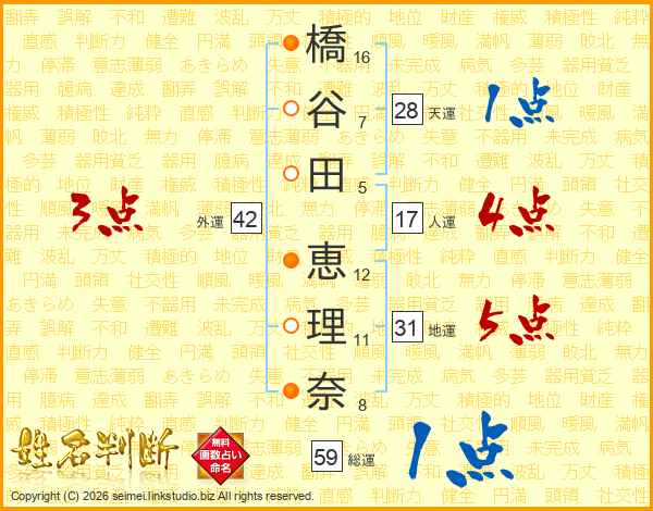 橋(16画)谷(7画)田(5画) 恵(12画)理(11画)奈(8画)